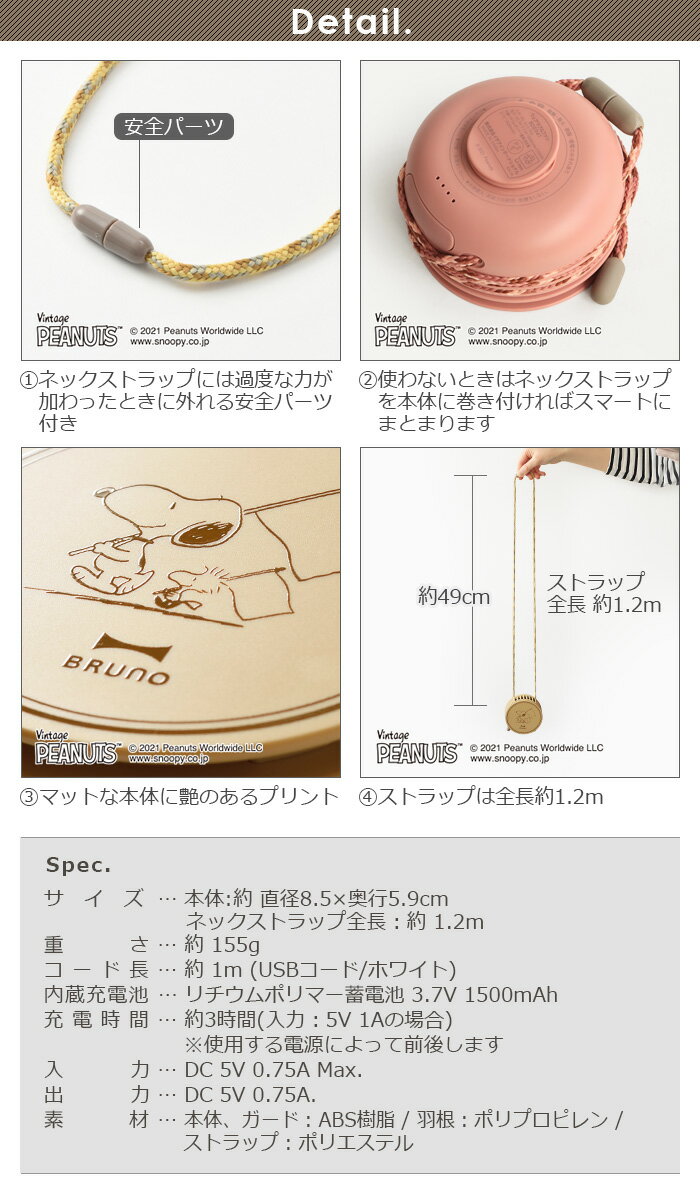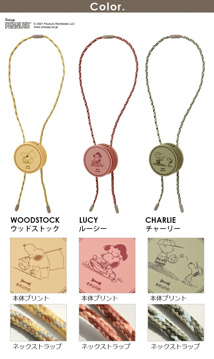 ハンズフリータイプ USB充電式ポータブル扇風機 首に掛けて使えるネックストラップ付きの充電式ポータブル扇風機「BRUNO ウェアラブルファン」にPEANUTSキャラクターたちのプリント柄の登場です。